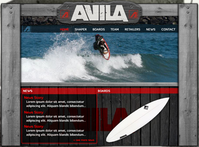 This class competition was for an actual client, Avila Surf Shop. Taking the provided images and style ideas from the Avila owners, the 15 students came up with many different ideas. The competition ending with multiple parts of different students sites being used. My Boards and Contact page ideas were used on the clients finished web site. Since flash is no longer useable the website can't be viewed at the moment.